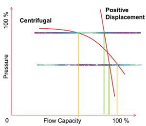Grafik Perbandingan Flow vs Pressure Antara Roots Blower dan Centrifugal Blower