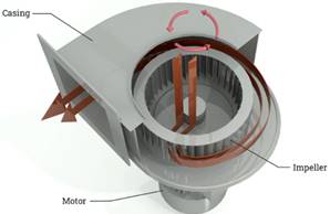 Pada centrifugal blower, proses kerja sebagai berikut: