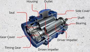 • Konstruksi utama terdiri dari : dua rotor, timing gear, seal, housing, shaft, dan bearing.