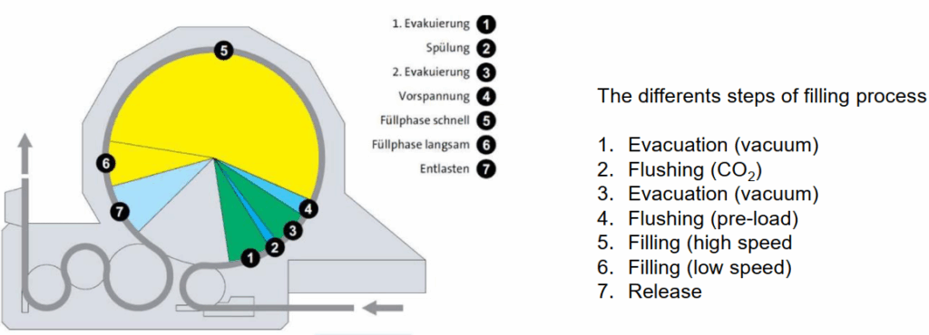 Setelah Langkah 7, ada sedikit sisa bir yang tertinggal di ruang mati (dead volume) pada filling head. Volume sisa ini akan dikeluarkan kembali pada langkah 1 sehingga menyebabkan carry-over bir ke jalur vakum (mencapai hingga 100 liter per jam).